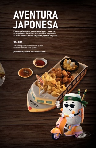 AVENTURA JAPONESAPapas crujientes en espiral para jugar y saborear, acompa%u00f1adas de pollo o pescado blanco apanado al estilo casero. Incluye un postre japon%u00e9s sorpresa.$24.000Adiciona pasta cremosa con quesocheddar por tan solo $4.900%u00a1Diversi%u00f3n y sabor en cada bocado!