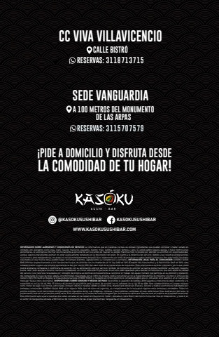 @KASOKUSUSHIBAR KASOKUSUSHIBARWWW.KASOKUSUSHIBAR.COMINFORMACI%u00d3N SOBRE AL%u00c9RGENOS Y CONDICIONES DE SERVICIO: Le informamos que en nuestras cocinas se utilizan ingredientes que pueden contener o haber estado en contacto con al%u00e9rgenos como soya, man%u00ed, nueces, mariscos, pescados, huevos, trigo, sulfitos, ajonjol%u00ed, l%u00e1cteos y apio. Si usted padece alguna alergia o tiene restricciones alimentarias, le solicitamos informar oportunamente al personal de servicio antes de realizar su pedido. Haremos todo lo posible por atender su solicitud con responsabilidad, aunque algunos ingredientes podr%u00edan no estar expresamente detallados en la descripci%u00f3n del plato. En cuanto a la din%u00e1mica del servicio, debido a que nuestras preparaciones se cocinan a altas temperaturas, los platos se sirven inmediatamente despu%u00e9s de su elaboraci%u00f3n con el fin de preservar su sabor, textura y frescura. Por esta raz%u00f3n, los platos solicitados en una misma mesa pueden llegar en tiempos distintos. Agradecemos su comprensi%u00f3n y confianza. INFORMACI%u00d3N LEGAL PARA EL CONSUMIDOR: KAS%u00d3KU SUSHI BAR informa respetuosamente a sus consumidores que, de acuerdo con lo establecido en la Ley 1480 de 2011 (Estatuto del Consumidor) y la Resoluci%u00f3n 2649 de 2013, este establecimiento sugiere una propina equivalente al diez por ciento (10%) del valor total de la cuenta antes de impuestos. Esta propina tiene car%u00e1cter voluntario, por lo que usted podr%u00e1 aceptarla, rechazarla o modificarla de acuerdo con su apreciaci%u00f3n sobre el servicio recibido. Al momento de solicitar la cuenta, podr%u00e1 manifestar su decisi%u00f3n respecto a este valor, bien sea para incluirlo, excluirlo o establecer un monto diferente. El personal de servicio est%u00e1 capacitado para atender su solicitud sin que esto afecte la calidad del servicio. Los recursos recaudados por concepto de propina se destinan exclusivamente a reconocer el trabajo del equipo humano que participa en la atenci%u00f3n y operaci%u00f3n del restaurante. En caso de tener alguna inconformidad relacionada con el cobro de propina, podr%u00e1 comunicarse con la Superintendencia de Industria y Comercio a trav%u00e9s del n%u00famero (601) 592 0400 en Bogot%u00e1, la l%u00ednea gratuita nacional 01 8000 910165, o mediante el correo electr%u00f3nico contactenos@sic.gov.co, indicando en el asunto o en el cuerpo del mensaje: %u201cQueja cobro de propina%u201d. DISPOSICIONES SOBRE CONSUMO Y MEDIOS DE PAGO: Se proh%u00edbe el expendio de bebidas embriagantes a menores de edad, conforme a lo estipulado en la Ley 124 de 1994. El exceso de alcohol es perjudicial para la salud, de acuerdo con lo se%u00f1alado en la Ley 30 de 1986. Este establecimiento no acepta cheques como medio de pago. Las formas autorizadas incluyen: efectivo, tarjetas d%u00e9bito y cr%u00e9dito (Visa, MasterCard, American Express, Diners) y medios electr%u00f3nicos habilitados por entidades reconocidas. KAS%u00d3KU SUSHI BAR es un espacio 100% libre de humo de cigarrillo, en cumplimiento de la normativa vigente sobre ambientes saludables. Todos los precios incluidos en el men%u00fa llevan incorporados los impuestos de ley. Las im%u00e1genes, nombres y descripciones contenidas en esta carta tienen fines ilustrativos; por tanto, la presentaci%u00f3n final de los productos podr%u00e1 variar. Este documento y su contenido est%u00e1n protegidos por la normativa nacional e internacional en materia de propiedad intelectual. Esta informaci%u00f3n aplica para nuestras dos sedes ubicadas en la ciudad de Villavicencio: Sede 1, ubicada en Calle Bistr%u00f3 del Centro Comercial Viva en Villavicencio, y Sede 2, en el sector de Vanguardia ubicada a 100 metros del monumento de las Arpas V%u00eda Restrepo Vanguardia en Villavicencio.CC VIVA VILLAVICENCIO%u00a1PIDE A DOMICILIO Y DISFRUTA DESDE LA COMODIDAD DE TU HOGAR!SEDE VANGUARDIACALLE BISTR%u00d3RESERVAS: 3118713715RESERVAS: 3115707579A 100 METROS DEL MONUMENTO DE LAS ARPAS